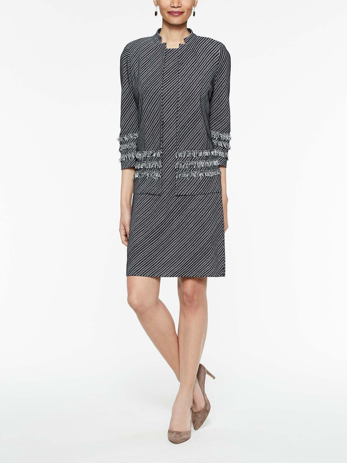Here's a jacket that offers the fringe benefits you're seeking this spring. The black-and-white knit features a diagonal pattern, playful trim, and a slimming hook-and-eye waist closure. It's a trendworthy design with the uncanny ability to transition from the workweek to weekend with style; add our Bias Pattern Dress for a suited look.