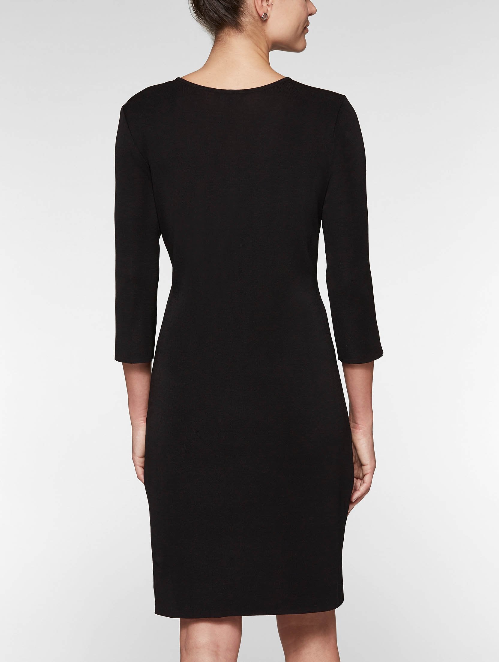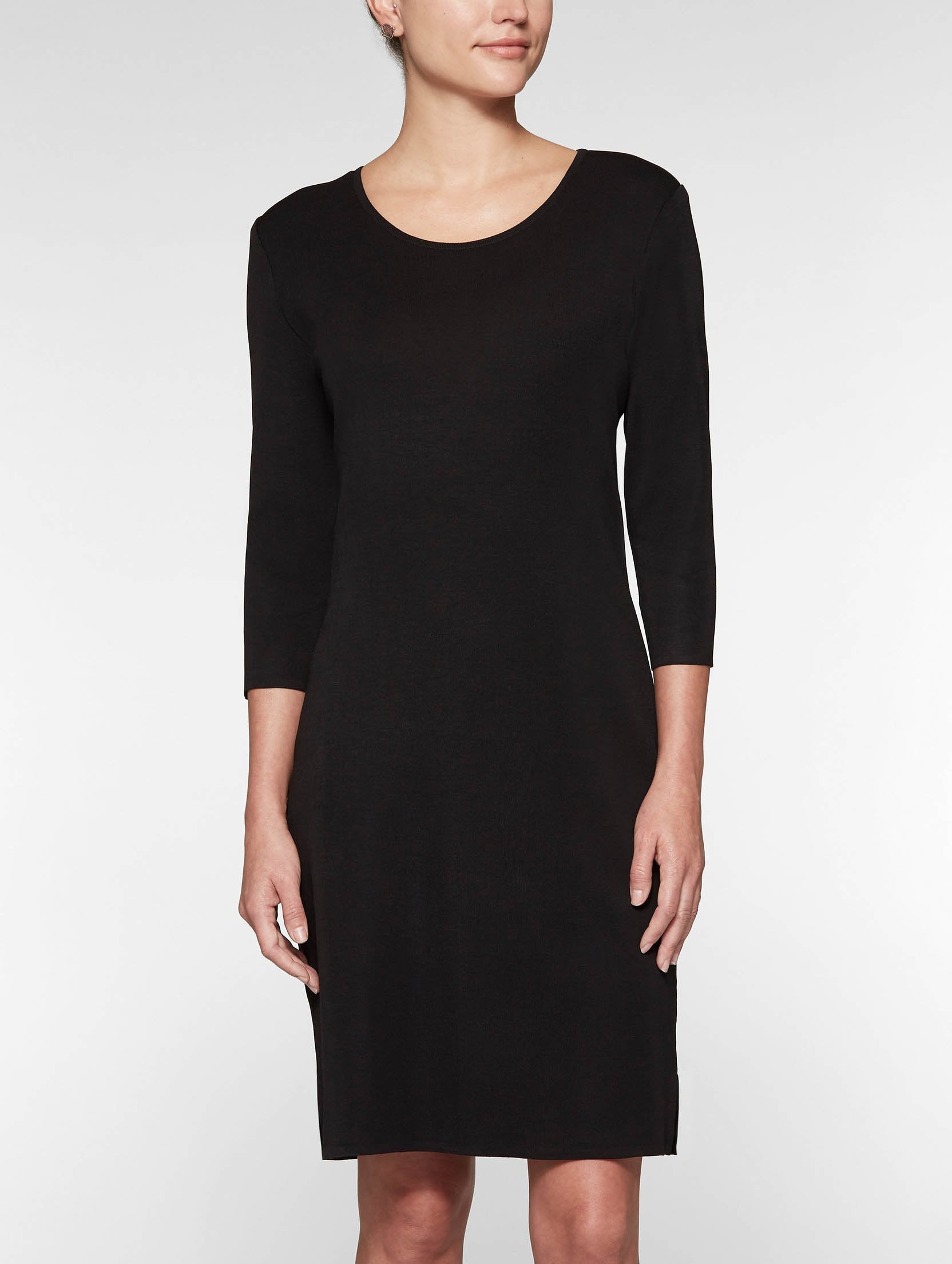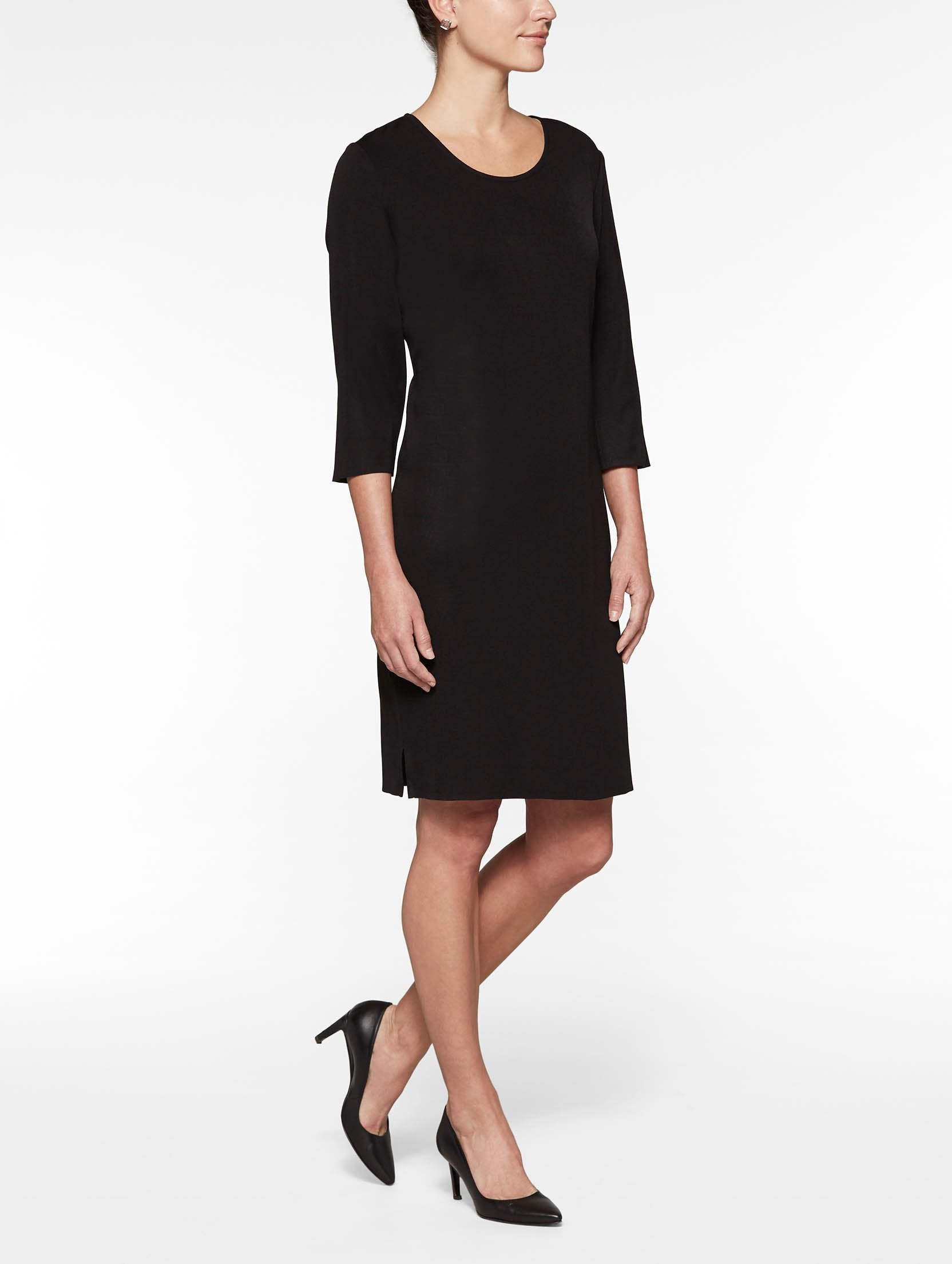 A classic black sheath dress is always in fashion, and ours features a seasonless knit and 3/4 sleeves for year-round versatility. Add a jacket for business refinement or dress it up with our jewelry for a night on the town.