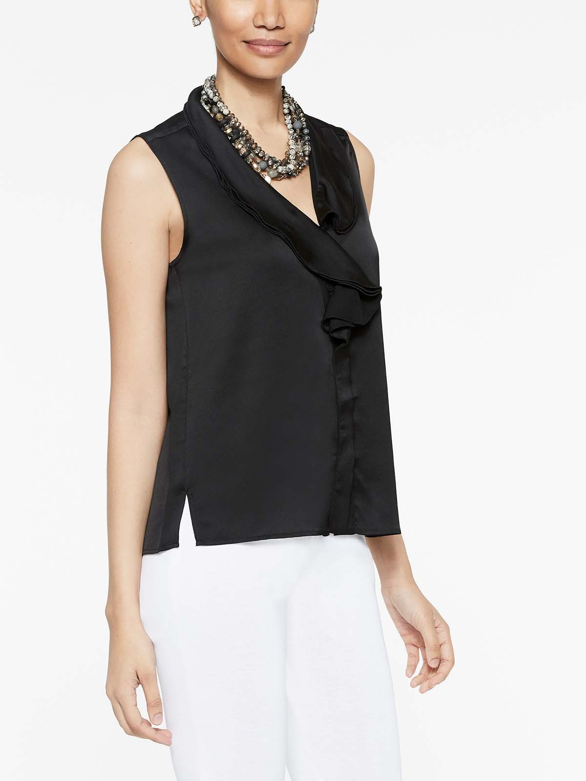Feminine frills cascade down the front of our Crepe de Chine Ruffle Waterfall Blouse. The refined top features pullover ease and a softly draping wrinkle-resistant woven fabric, for style that looks as great as it feels. It's a beautiful touch of elegance under almost any jacket, or wear it solo on balmy days.